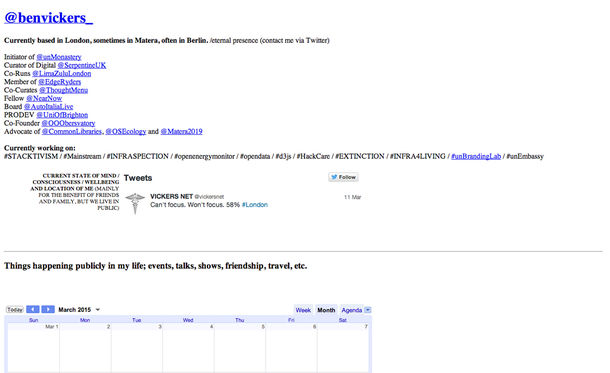 Ben Vickers è un curatore, scrittore, esploratore, tecnologo e luddista, attivo tra Londra e Atene. Attualmente è curatore del Dipartimento Digitale della Serpentine Gallery e co-direttore del LIMAZULU Project Space a Londra. Dal 2014 è sostenuto da Near Now ed è facilitatore per lo sviluppo del sistema open-source unMonastery, prototipo di uno spazio sociale contraddistinto da una nuova mentalità civile, nato a Matera ma che si svilupperà in altri paesi europei a partire dal 2015. Collabora nel tempo libero a EdgeRyders, e co-gestisce gli incontri nomadici di The Thought Menu e di Open Funerals.